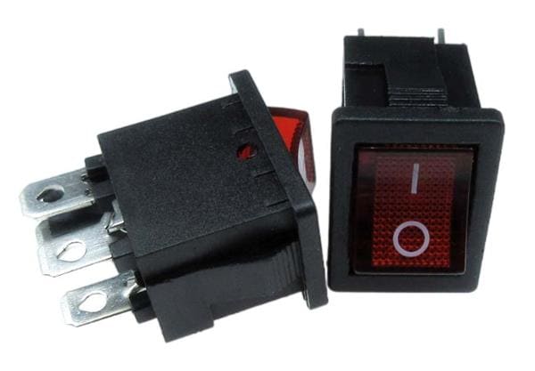 Adam Tech SW-R2-3A-F-LR13-4 Miniature Miniature Rocker Switch, panel mount, .187in [4.75mm] solder, red lighted actuator (12V LED voltage), rectangular