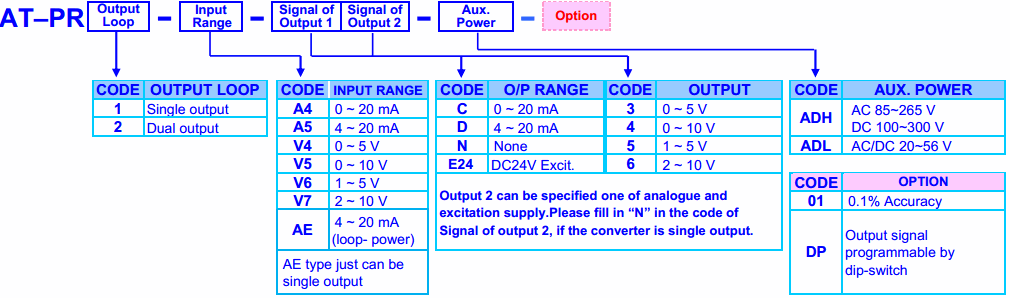 Output: 0~5V / 0~10V / 1~5V / 2~10V / 4~20mA / 0~20mA changeable by dip switches and terminals