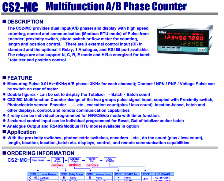 Adtek CS2-MC Multifunction A/B Phase Counter (0.01Hz~6KHz, 2 channels)