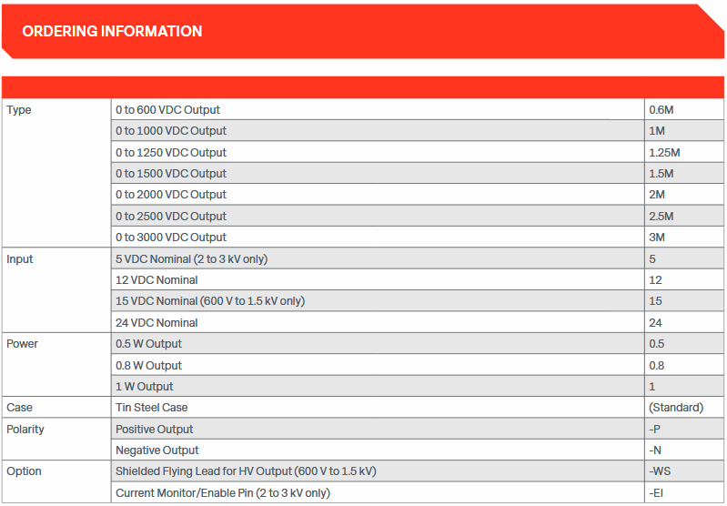 - Input Voltage Vin (Pins 1 and 2): 15 ±1 (600 V ~ 1.5 kV ONLY)