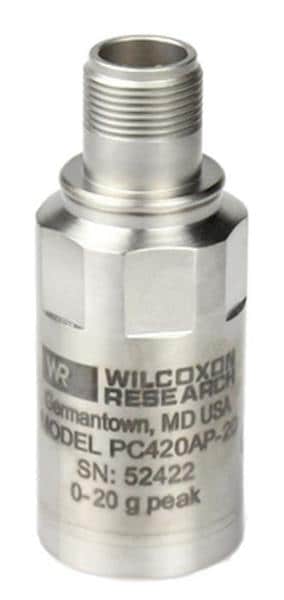Amphenol Wilcoxon PC420AP-10 Vibration Sensors Top exit, 105 C, 4-20 mA ( 5% @ full scale) proportional to Acceleration, Equivalent Peak, 10 g (98 m/sec2), 1/4-28 mounting hole (stud included), MIL-C-5015 connector.