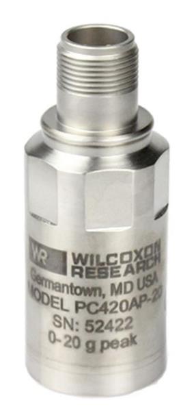 Amphenol Wilcoxon PC420VR-50-DV Vibration Sensors Top exit, 85 C, 4-20 mA ( 5% @ full scale) proportional to Velocity, RMS, 5.0 ips (127 mm/sec), Dynamic Velocity 100 mV/ips, (3.94 mV/mm/sec), 1/4-28 mounting hole (stud included), 3 pin MIL-C-5015 connector.