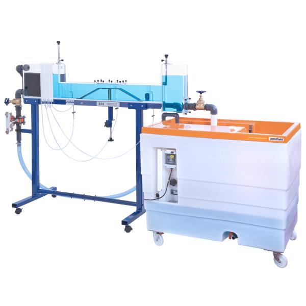 The Armfield S16 Hydraulic Flow Demonstrator simply connects to a standard F1-10 Hydraulics Bench to permit the study of the following basic aspects of fluid flow: