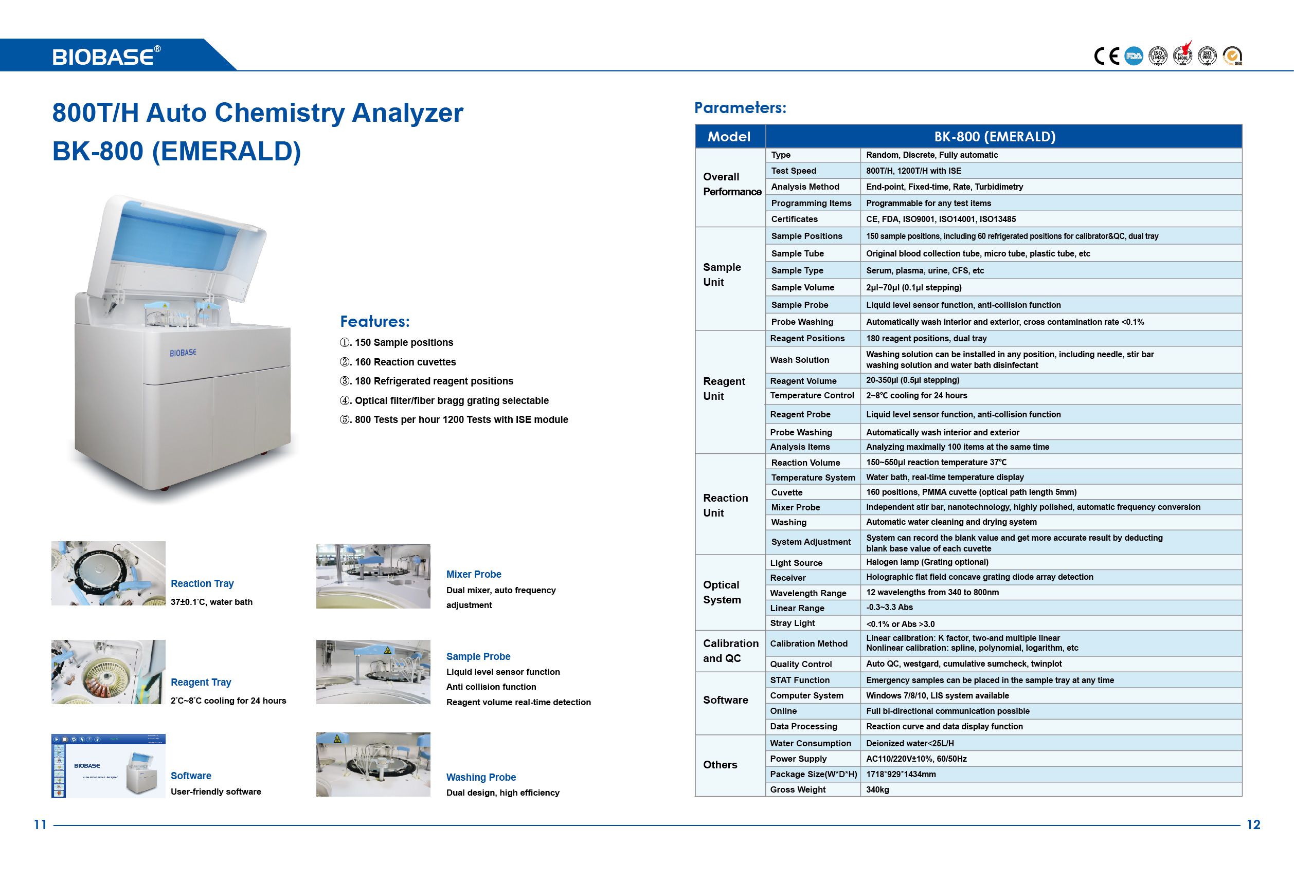 Features: 150 Sample positions; 160 Reaction cuvettes; 180 Refrigerated reagent positions; Optical filter/fiber bragg grating selectable; 800 Tests per hour 1200 Tests with ISE module