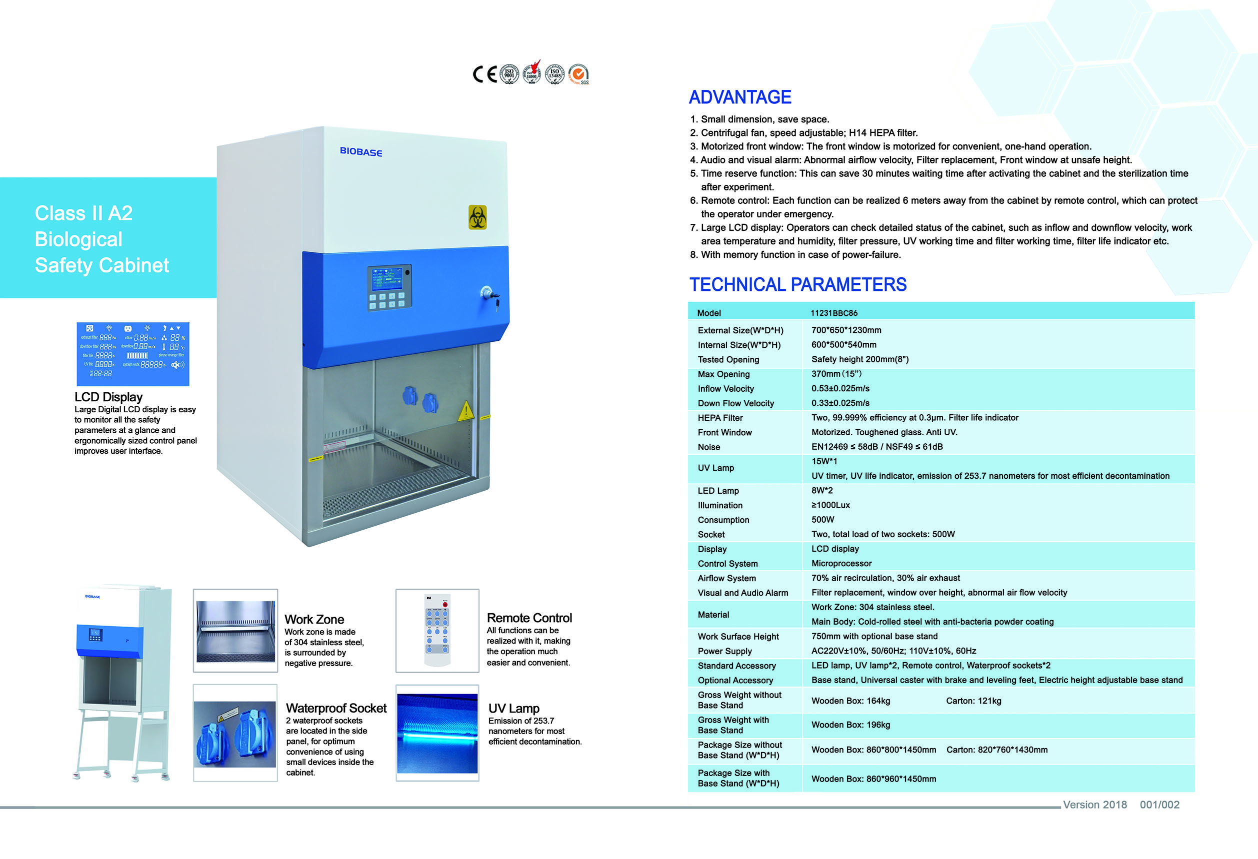 UV Lamp:15W*1; UV timer, UV life indicator, emission of 253.7 nanometers for most efficient decontamination.