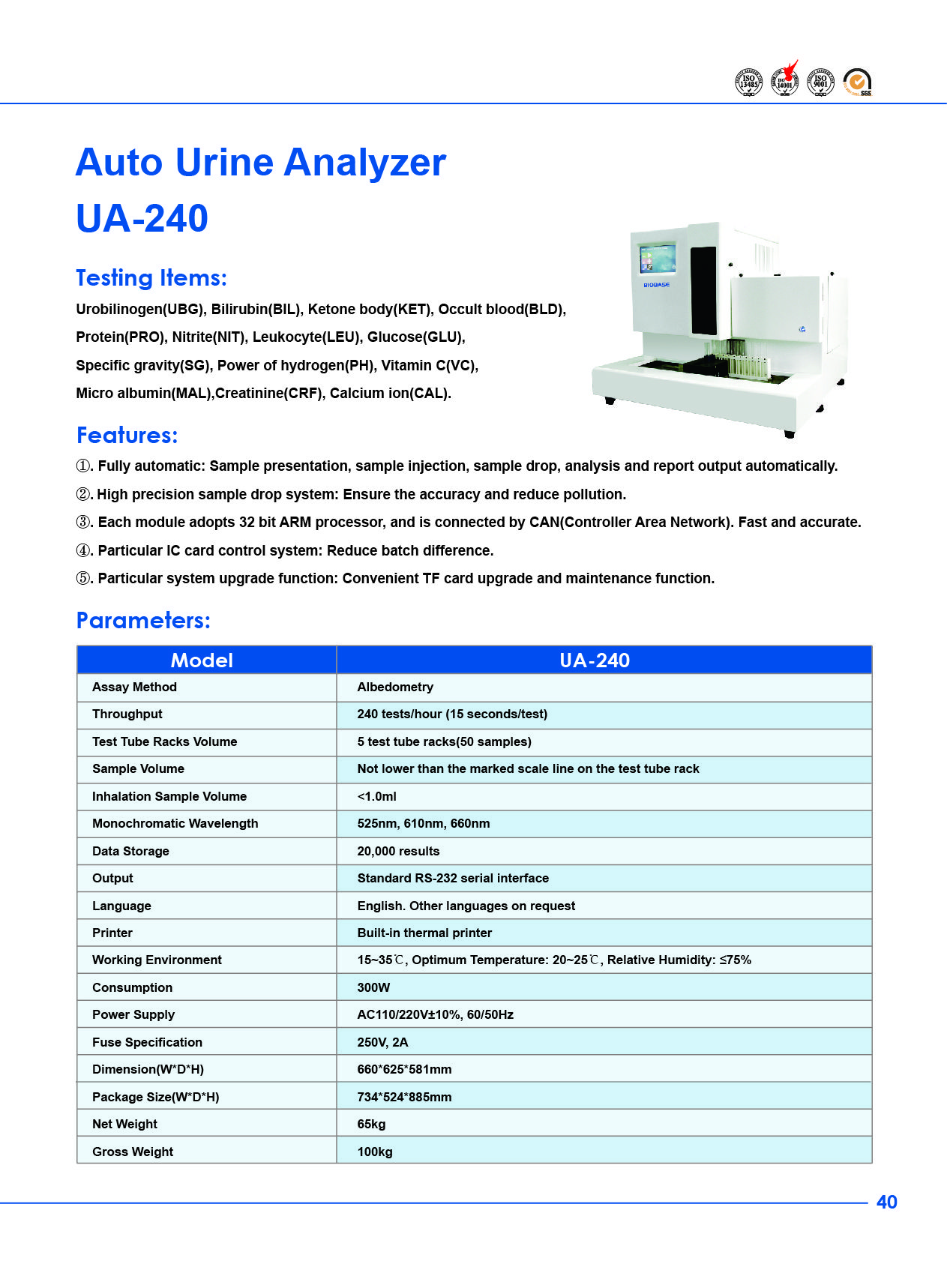 Features: Fully automatic; High precision sample giving system; Each module adapts 32 bit ARM processor; Can be connected to urine tangible composition analyzer.