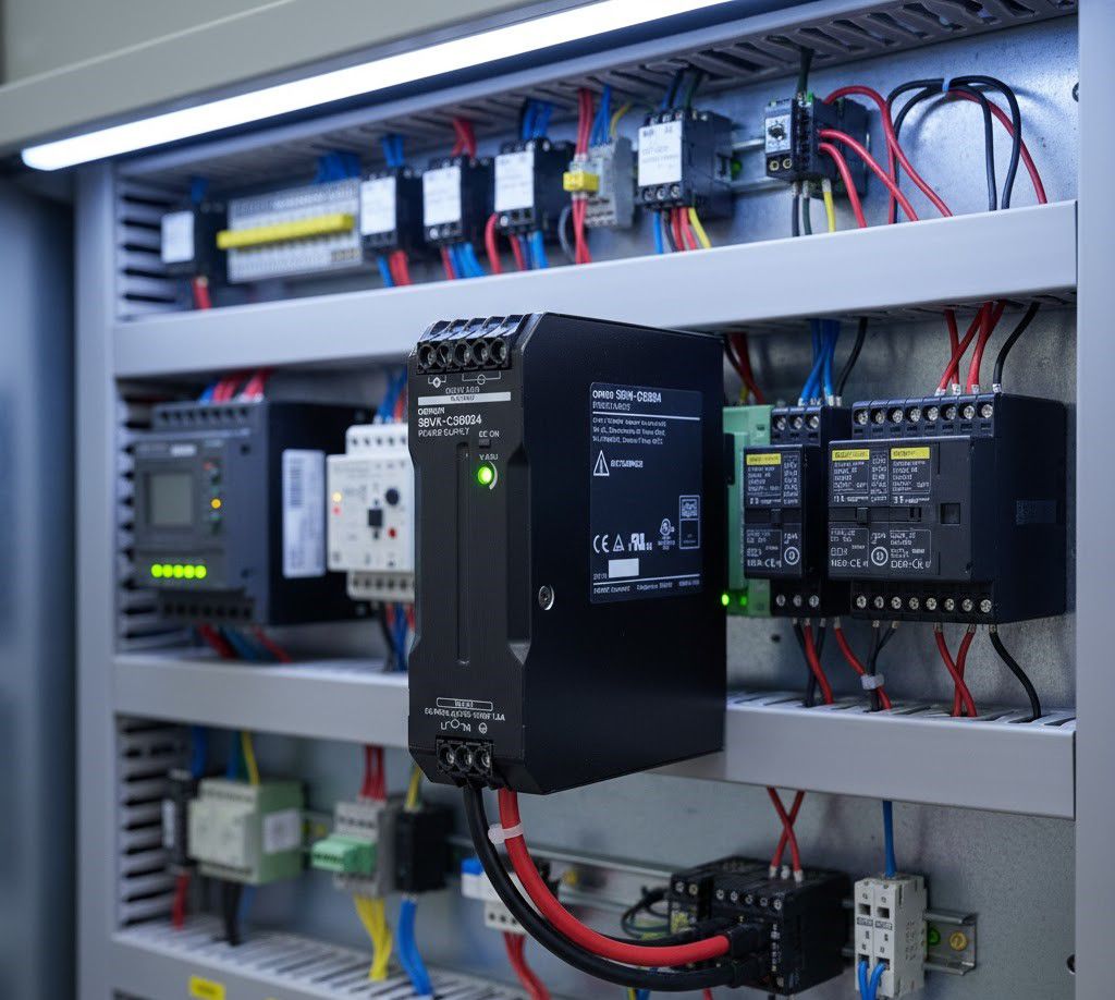 The solution for this case is to choose a power source that can withstand instantaneous overload current well or choose a power source with a large capacity. A 24V 10A power source will be a safe choice to ensure the pump starts smoothly. Omron's high-quality power lines such as the S8VK or S8FS series often have better load charts and starting current capacity than floating power types.