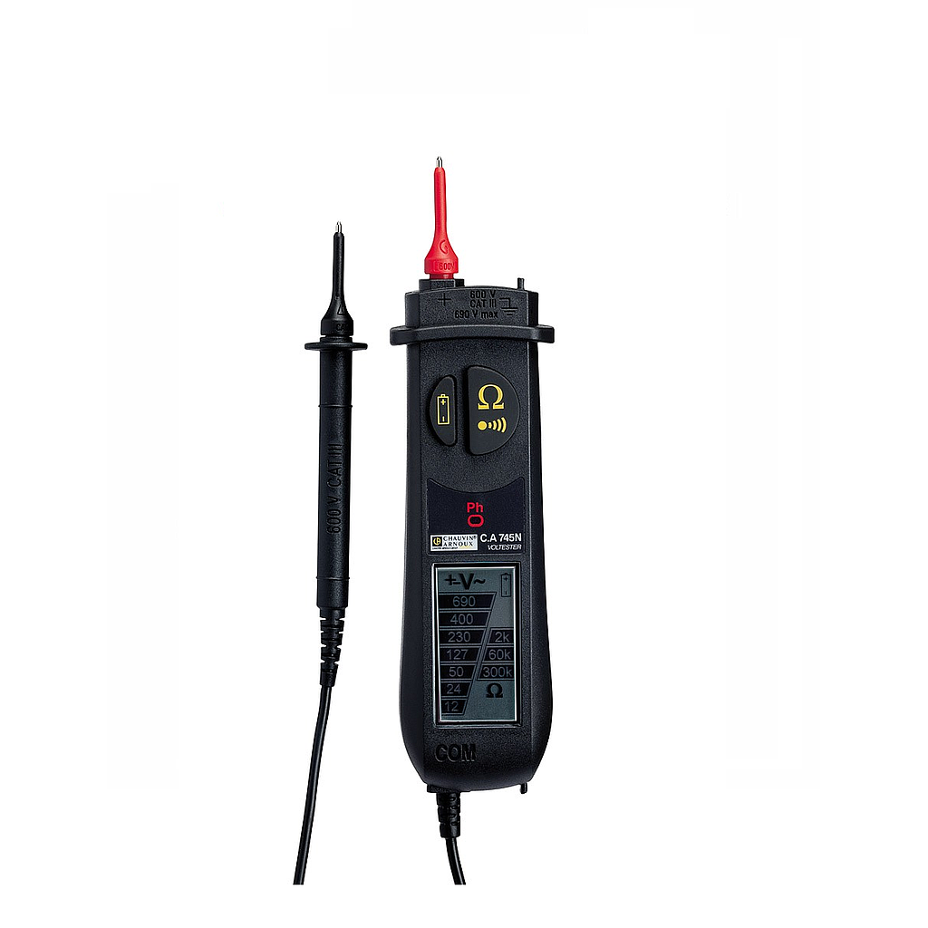 The C.A 745N can test AC and DC voltage up to 690 V, with automatic AC or DC detection. It displays the resistance value on 3 thresholds and also offers audible continuity testing. The In addition, the C.A 745N can be used for single-pole phase testing. With the C.A 745N, there is no risk of tripping high-sensitivity RCDs when performing a phase/earth test.