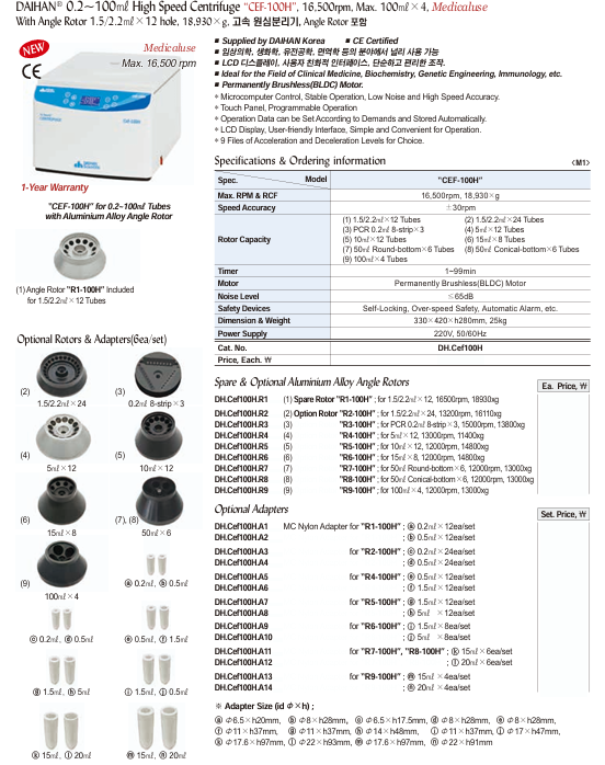 DaiHan CEF-100H 0.2~100㎖ High Speed Centrifuge (16,500rpm, 18,930×g)