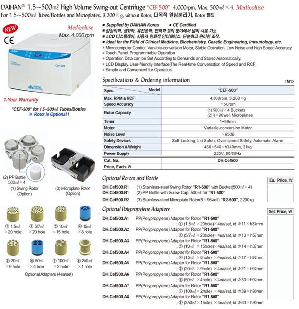 DaiHan CEF-500 1.5~500㎖ High Volume Swing-out Centrifuge (4,000rpm, 3,200×g)