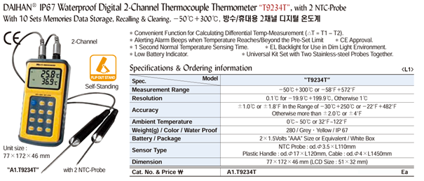 DaiHan T9234T IP67 Waterproof Digital 2-Channel Thermocouple Thermometer | EMIN.COM.MM