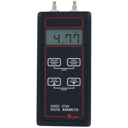 Dwyer 477AV-000 Handheld Digital Manometer for Pressure, Flow & Velocity ± Calibration (± 0.5 %, 4004 FPM, 1 inH₂O, Barbed Connection, 1/8 in)