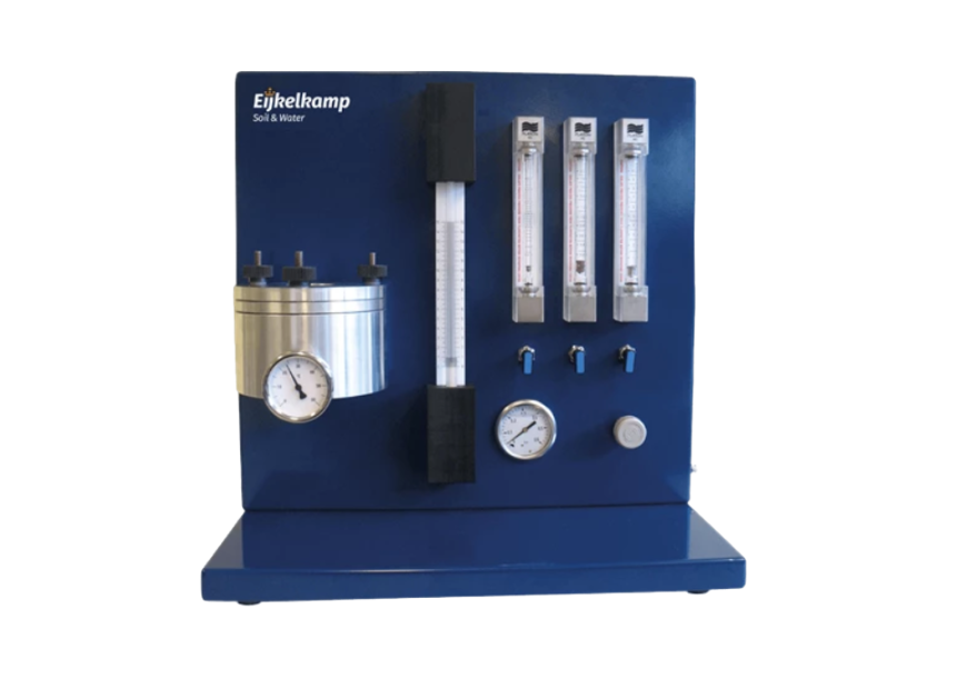 Air permeameter to measure and register the air permeability of soil and soil samples in the laboratory. Complete instrument with 3 flow meters for laboratory measurements, including exchangeable sample holder and pressure regulator.