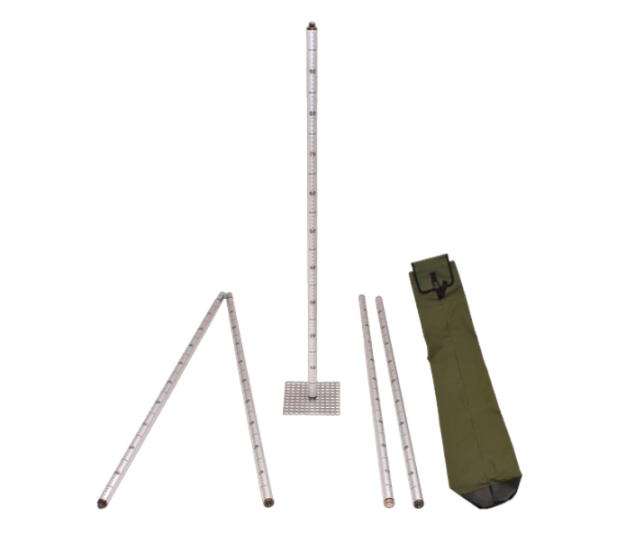 The sediment level stave is part of the standard set to measure the depth of sediment down to a depth of 4 metres. The standard set can be extended to 7 metres. A sediment level stave is a sounding rod used for sounding the sediment layers in surface waters. Either a point or a sediment grid can be mounted to the bottom. The set comprises 4 sediment measuring rods of anodic aluminium with screw couplings. These rods are 1 metre long, and have a diameter of 25 millimetres. The sediment measuring rods are marked out in 5 centimetres markings.