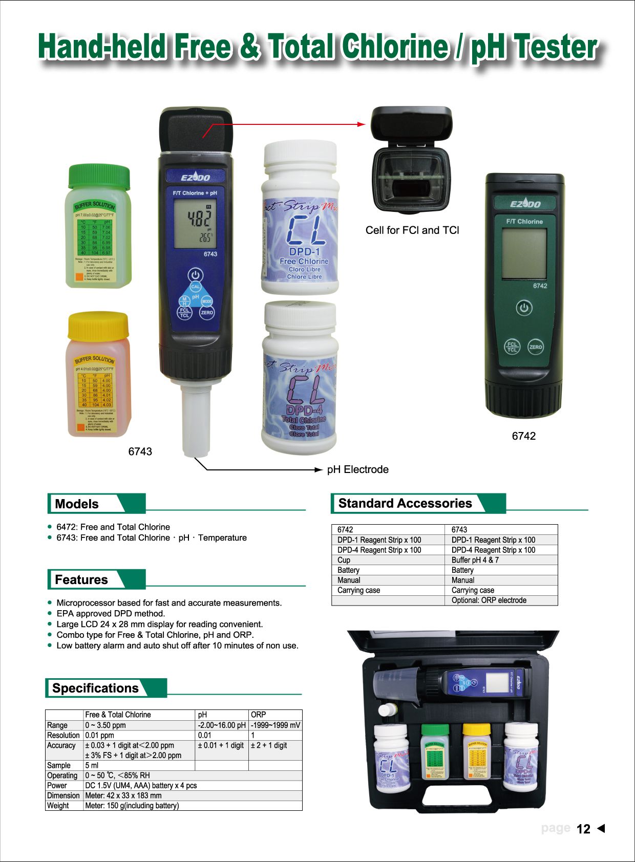 Accessories: pH electrode, pH 4 buffer solution 50ml x 1, pH 7 buffer solution 50ml x 1, soaking solution 5ml x 1, FCL Reagent strip x 50 pcs(DPD-1),TCL Reagent strip x 50 pcs (DPD-4), Battery, Cup, Carrying case.