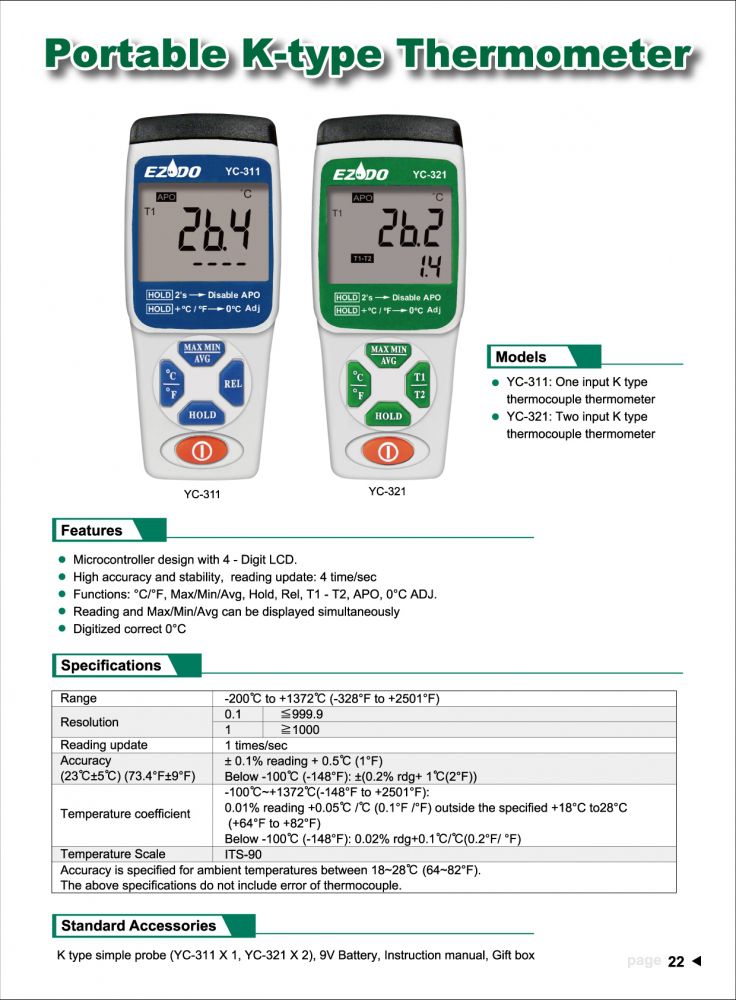 Accuracy (23°C ± 5°C) (73.4°F ± 9°F): ± 0.1% reading + 0.5°C (1°F); below -100°C (-148°F):± (0.2% rdg + 1°C(2°F))