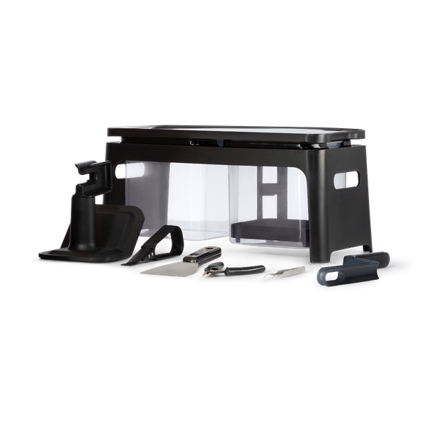 Includes rinse station, 2 rinse buckets, rinse basket, rinse bottle, finishing tray, tank tool, tweezers, scraper, removal tool, jig, flush cutters, and disposable nitrile gloves.