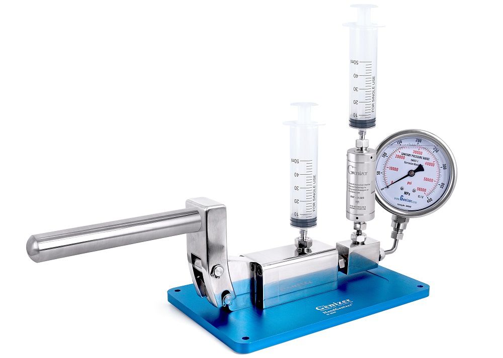 Compared to pneumatic or hydraulic liquid processors, the HandGenizer is an eco- and budget-friendly mini homogenizer. It is a manual high pressure homogenizer that works by shifting the pump handle up and down. It needs no PLC control system or electricity and is perfect for basic experimental tasks, particularly when handling small quantities of liquid samples.