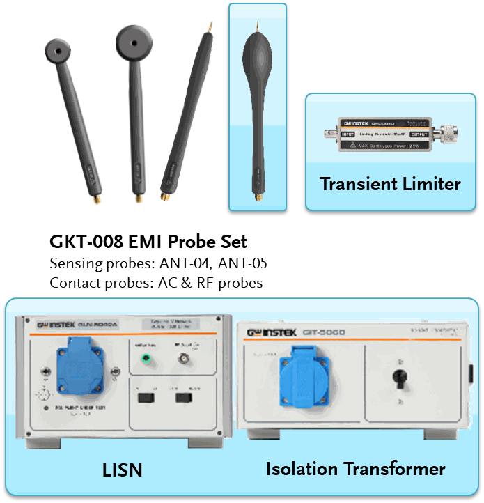 Spectrum analyzer with an input impedance of 50 W can use the GKT-008 probe. However, the functions related to GKT-008 in the EMC Pretest built in GSP-9330 cannot be used. In terms of hardware architecture, the GKT-008 is designed to be used with a spectrum analyzer. Spectrum analyzer with 50 Ω input impedance can use the GKT-008 probe. However, the GKT-008 has some very useful extension functions that must be used in conjunction with the EMC Pretest feature of the GSS-9330 spectrum analyzer. These features include: