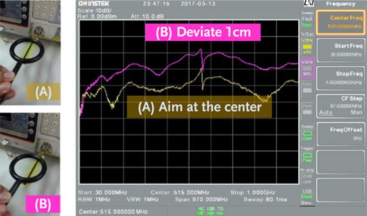 Moreover, in the process of EMI debugging, the problem of a magnetic field or an electric field must be considered to solve whether for isolation mechanism, filter circuit or grounding design of the circuit in terms of techniques and methods for solving the problem. The main method is to measure the frequency and amplitude (energy) of the EMI noise so as to confirm which circuit or component produces the interference signal source. The interference can be improved by suppressing the current (such as series resistance) or voltage (such as parallel bypass capacitor). Using the near field probe of GKT-008 to directly measure the electromagnetic energy can directly measure the actual near field electromagnetic energy. There is no need to measure the electric field and the magnetic field separately by using GKT-008, which becomes a more efficient tool. In some special applications, separate analysis of the electric and magnetic fields is required such as larger power motor rotation systems. | ||||||||||||||||||||||