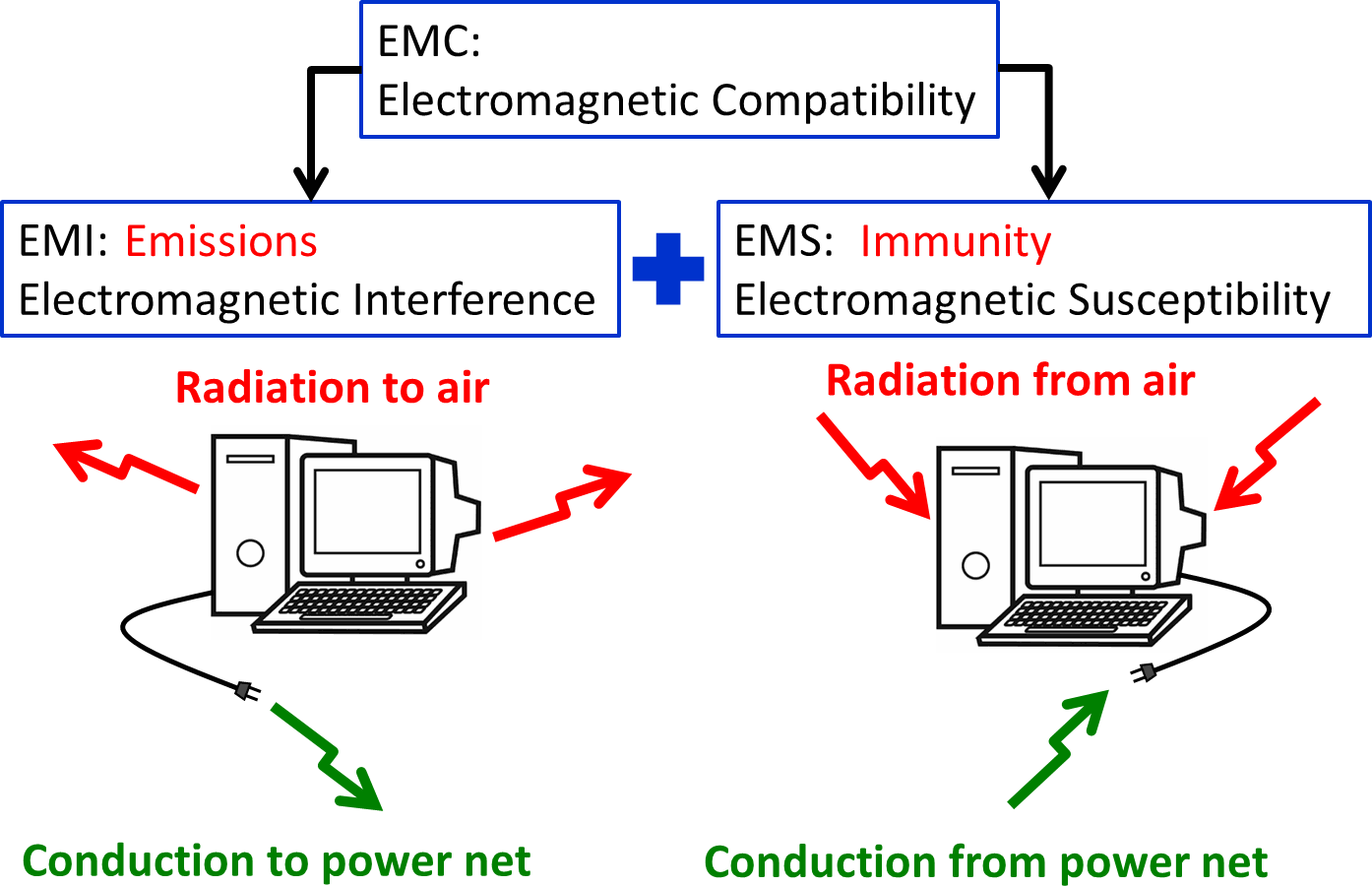 EMC includes EMI and EMS. EMI is the self-emitted noise poses impact on other electronic devices, and EMS is affecting electronics products by surrounding electronic devices' noise.