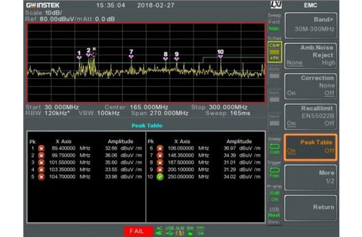 The EMI signal detection using the GSP-9330 focuses on the source of possible EMI during the Pre-Compliance phase and the Debug process, so PK+ Detector is usually used at this stage to find all EMI sources and identify larger sources of signals to analyze. If you want to know the value of QP and AVG at the frequency point found by PK+, manually set the Span to narrow or zero frequency and set the detection mode to QP or AVG. | ||||||||||||||||||||||