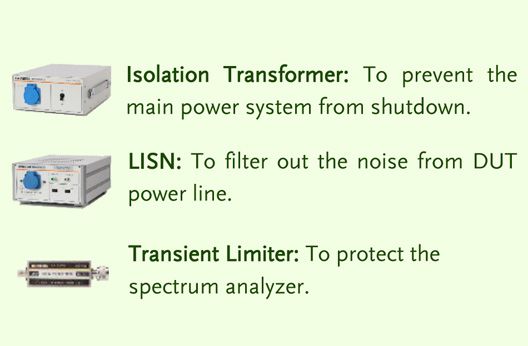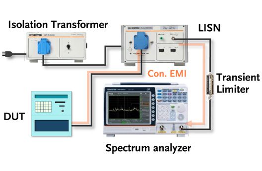 GSP-9330 spectrum analyzer collocating with LISN GLN-5040A and an isolated transformer GLN-5060 can conduct conductive EMI.