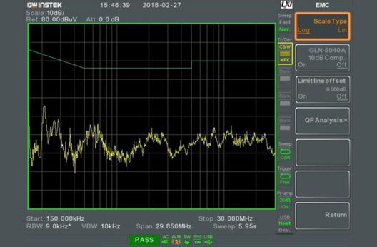 A 10dB attenuator is designed in the GLN-5040A to protect the spectrum analyzer during testing. In the GSP-9330, the compensation function is also designed. 10dB compensation can be obtained by turning on (EMC Pretest >> EMC ON >> EMI Test >> Band selects the conduction band >> More 1/2 >> GLN-5040A 10dB Comp. ON / OFF >> Select ON to get the real value.