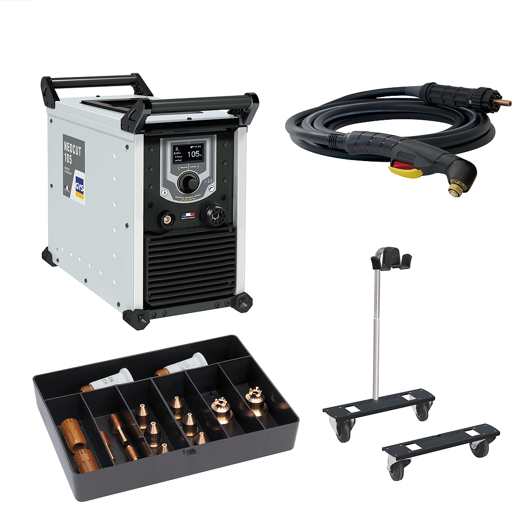 The NEOCUT 105 is a plasma cutter with a duty cycle of 100% at 105 A for cutting work up to 50 mm thick in industrial environments. It is equipped with automatic air pressure management, in all modes, offering optimum cutting quality throughout the lifespan of the consumables. Can also be connected to a cutting table, its «Marking» mode is perfect for tracing and identifying parts.