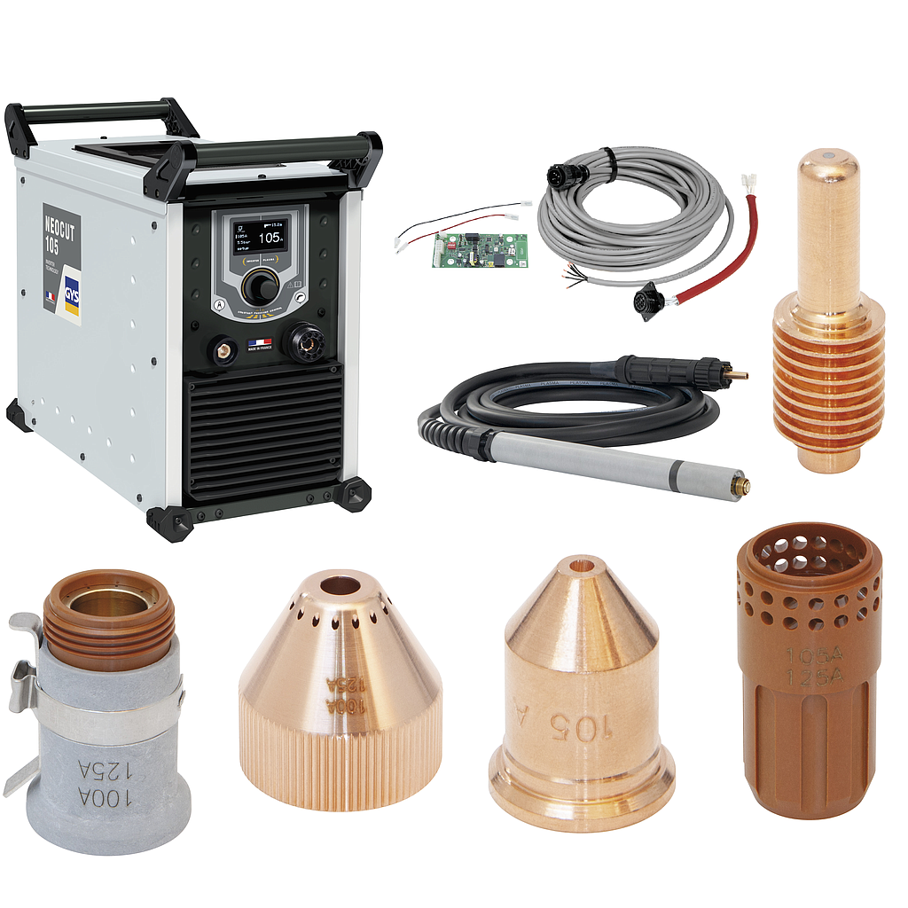 The NEOCUT 105 is a plasma cutter with a duty cycle of 100% at 105 A for cutting work up to 50 mm thick in industrial environments. It is equipped with automatic air pressure management, in all modes, offering optimum cutting quality throughout the lifespan of the consumables. Can also be connected to a cutting table, its «Marking» mode is perfect for tracing and identifying parts.