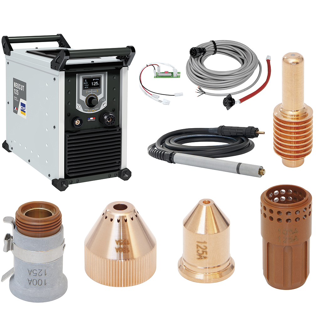 The NEOCUT 125 is a plasma cutter with a duty cycle of 100% at 125 A for cutting work up to 57 mm thick in industrial environment It is equipped with an automatic air pressure management, in all modes, offering an optimum cutting quality throughout the lifespan of the consumables. Also connectable to a cutting table, its «Marking» mode is perfect for tracing and identifying parts.