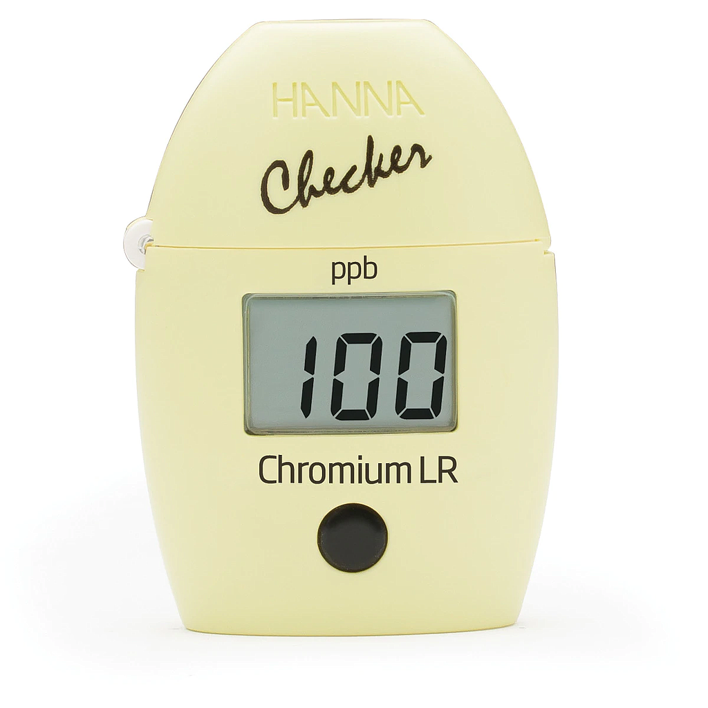 Ordering Information: HI749 Checker® is supplied with (2) sample cuvettes with caps, chromium VI LR reagent starter kit for 6 tests (6 powder reagent packets), battery, instructions and quick start guide.