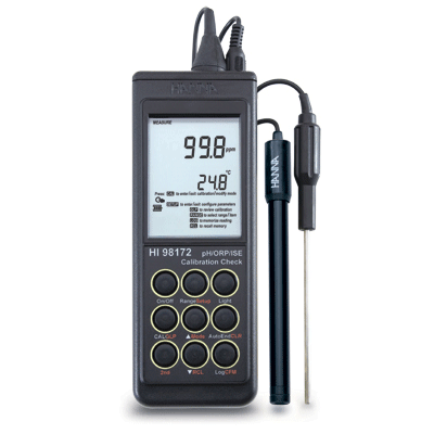 Order Information: HI 98172 is supplied with HI 1230B pH electrode, HI 7662 temperature probe, HI 70004 pH 4.01 buffer solution sachet, HI 70007 pH 7.01 buffer solution sachet, 100 mL plastic beaker, batteries, instructions and hard carrying case.