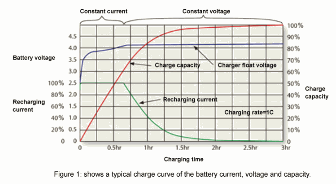 The most common battery charger mode for electric vehicle charging is to use constant current, constant voltage (CC-CV) mode. This means the battery is charged using a constant current level which allows quick charging of the battery while monitoring the battery voltages as it charges up. When the battery voltage reaches its peak voltage, the charger switches over to constant voltage mode preventing the battery voltage from reaching excessive levels. This method is illustrated in Figure 1.