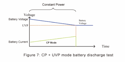 Operation in CP+UVP mode is very straightforward as the load automatically switches from CP constant power mode discharge mode to OFF mode. This prevents the battery from being damaged due to excessive discharging. This mode of operation is illustrated in Figure 7.
