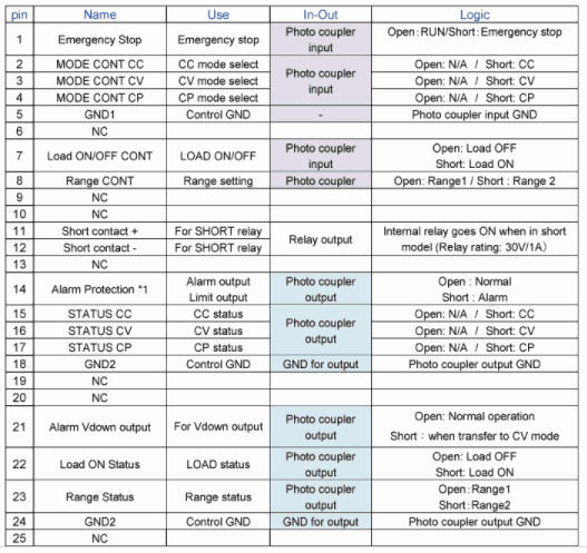 34000A series electronic load provided emergency stop signal input and alarms output interface on the Rear panel, connector to be D-sub25 Pin female port, Emergency stop signal and Alarm signal are isolated.