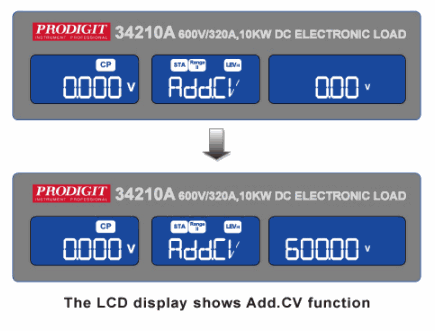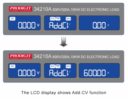 - Setting CC+CV or CP+CV upper limit voltage. Middle 5 digit LCD display “Add.CV4” , right 5 digit LCD display the unit is "V" , The Add.CV set ranges from 0.00 V to 600.00V step 0.01V by rotating the Setting knob.