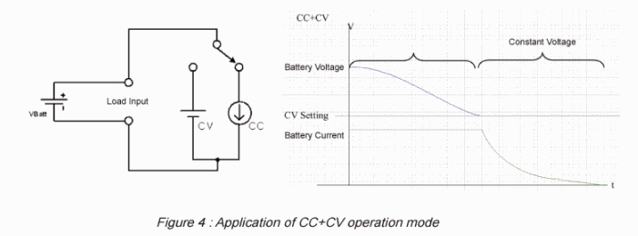 In this mode, discharging of the battery starts in CC mode of operation by setting a current discharge level (CC Set point) and a discharge stop voltage level (CV Set point) which determines full state of charge for the battery under test. When the battery voltage drops to the CV set point level, the electronic load stops discharging so that the battery voltage is maintained at the CV set value. Operation in CC+CV mode is very straightforward as the load automatically switches from CC constant current mode discharge mode to CV constant voltage mode. This prevents the battery from being damaged due to excessive discharging. This mode of operation is illustrated in Figure 4.