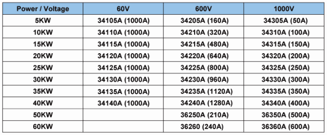 The Prodigit 34000A and 36000A Series of compact programmable high power DC loads offer 5kW to 60kW per cabinet DC load test capabilities up to 1000Vdc. Models are available at various voltage, power and current combinations to meet specific battery size and voltage/current requirement as shown in the table below. These programmable DC loads were designed to support electric chargers and electric vehicle battery pack development and test and have been deployed by car manufacturers and tier 2 automotive suppliers all over the world. Of specific importance is the ability of the 34300A and 36300A load modules to operate at full rated power up to 1000Vdc, covering all DC voltage standards used for electric vehicles.