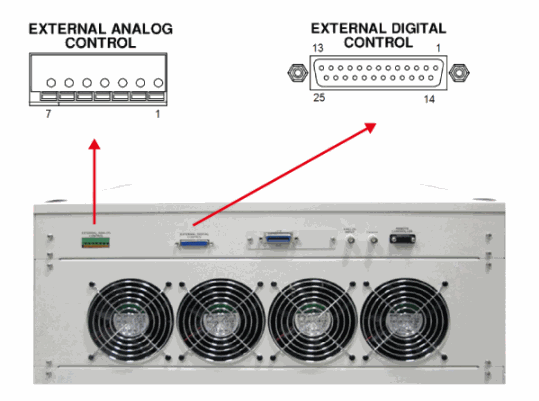 34000A series electronic load is provided optional PLC interface control, digital signals output interface on the rear panel, connector to be D-sub25 Pin female port. Inaddition, input analog signal to control the CC, CV and CP mode and the putput V-monitor and the I-monitor signal on the rear panel of 7 pin connectors