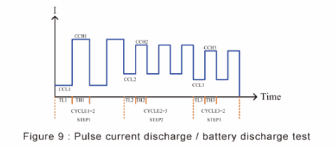 In addition to the four battery discharge test modes described above, the 34000/36000 electronic loads also support pre-set discharge time interval setting and pulse current discharge modes. Discharge current can also be programmed to follow a set step or ramp pattern as needed. A sample discharge current waveform is shown below. These specific discharge profiles can be used to simulate actual driving conditions dependent battery discharge profiles to test and evaluate battery performance and life-span.