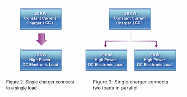 In case only a 20kW electronic load is available, a 5 KW load model can be added at any time to be used in parallel with the original 20kW load in Constant Voltage (CV) or Constant Resistive (CR) mode of operation. This is illustrated in Figure 2. This is due to the Prodigit load’s OPL function which allows CV or CR mode with parallel loads of unequal power ratings. This capability offers great flexibility in deploying multiple loads for a wide range of power requirements.