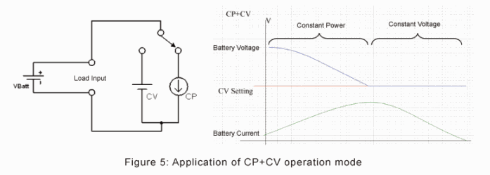 Operation in CP+CV mode is very straightforward as the load automatically switches from CP constant power mode discharge mode to CV constant voltage mode. This prevents the battery from being damaged due to excessive discharging. This mode of operation is illustrated in Figure 5.