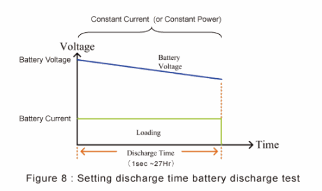 In time period discharge mode, the total discharge time is programmed on the load by the user as shown in Figure 8. When the discharge time reaches zero, discharging is stopped and the discharge time and end of discharge battery voltage will be displayed. Programmable range for discharge time interval ranges from 1 second to 99999 seconds or 27 Hours.