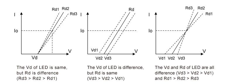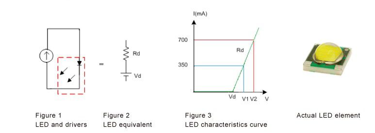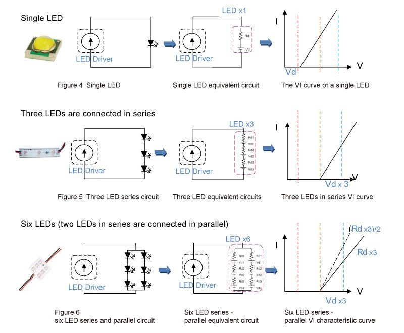 When the lumen output of a single LED is insufficient, you can choose a higher power LED or use multiple LEDs in series. Since multiple LEDs in series can increase the output brightness, multi-unit LED array packaged products are already available. In this case, Vd and Rd will be multiplied by the number of LEDs in series. Figure 4 through 6 show the equivalent circuit and the corresponding characteristic curve for a variety of LED series configurations and their various LED lighting applications: