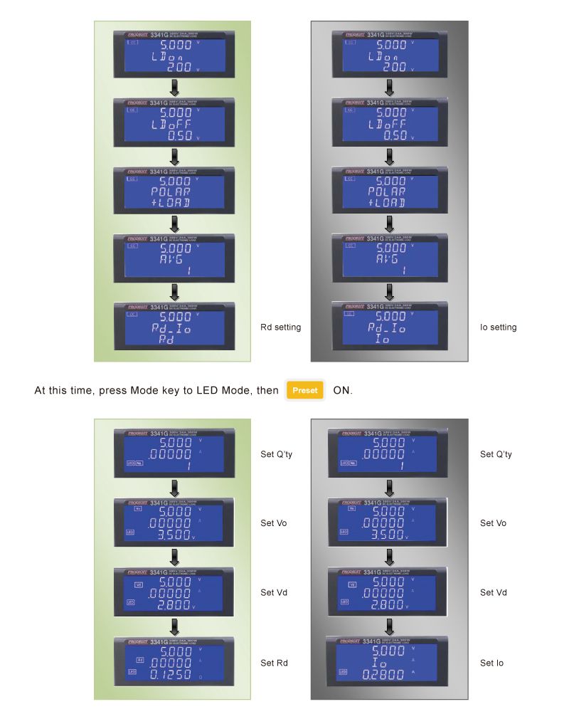 Vo & Io setting and actual output:3341G series LED mode load requires setting of Vo, lo and Rd so as to simulate the LED characteristics curve Shown in Figure 3, So it is not the actual LED load value.