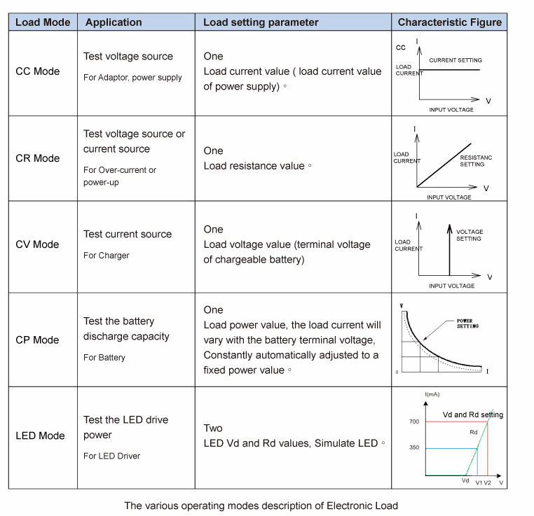 The CR mode of electronic load; only need to set one parameter, setting CR mode and R = Vo / lo, is used as a voltage source or current load, although the CR mode may be used to test LED Driver, but the equivalent circuit is different from the same characteristics as the LED and cannot achieve the effectiveness of LED simulation.