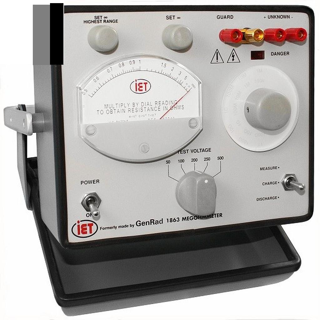 The GenRad 1863 Megohmmeter is the choice for production and inspection tests on devices with resistances up to 20 Tohms. The GenRad 1863 will measure resistance at any of five test voltages of: 50V, 100V, 200V, 250V, and 500 VDC. Compared to the GenRad 1864, which has adjustable test voltages from 10V to 1090V, this unit has fewer controls, and is the more economical of the two models.