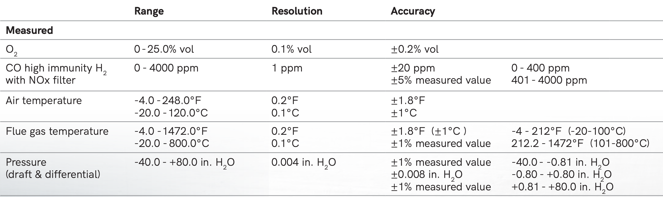 Flue gas temperature: -4.0 - 1472.0°F(-20.0 - 800.0°C)/ 0.2°F(0.1°C)/±1.8°F (±1°C ), ±1% measured value