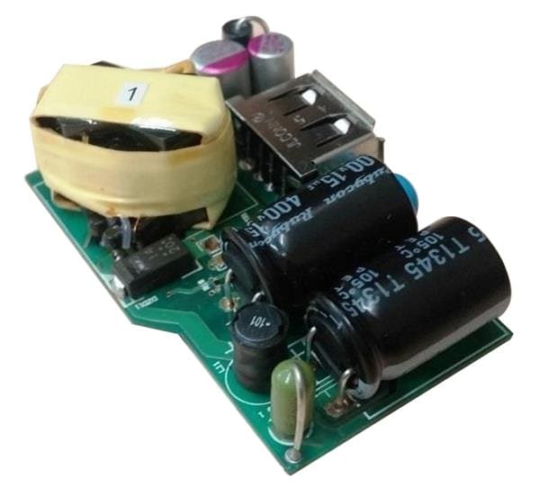 Infineon REF15WTHINPAKADAPTOBO1 AC/DC Primary/Secondary Side Controller - Flyback This is a 15W 5.0V / 3.0A USB adapter reference design using Infineon Quasi-Resonant PWM IC ICE2QS03G, CoolMOS IPL65R1K5C6S (ThinPAK 5x6), OptiMOS BSC067N06LS3G and high Speed Switching Diode BAS21-03W in a slim plug form factor with various mode o
